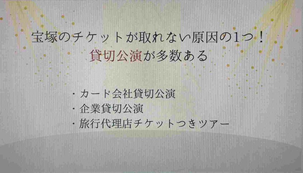 これだけ貸切公演枠が設けられていたら、一般販売で宝塚のチケットが確保されにくくなるので、取れないのも納得です。