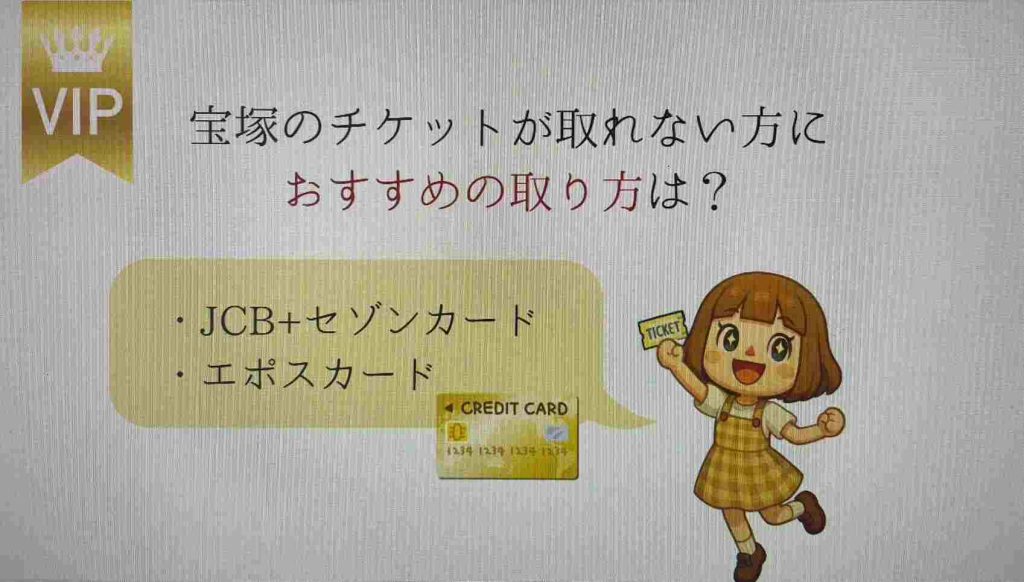 宝塚のチケットをお金をかけずに入手したい方は、プレイガイドや一般販売がメインになりますが、こちらも当たりにくいことから本サイトでは「クレジットカード」の活用をおすすめしています。