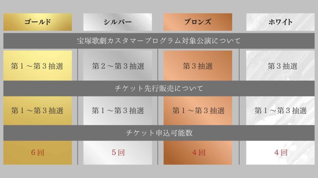 また、ブロンズとホワイトはチケットに申込できる回数は変わりませんが、ブロンズステージには、チケット落選後のダブルチャンスや宝塚歌劇の映像コンテンツの視聴特典などが設けられています。